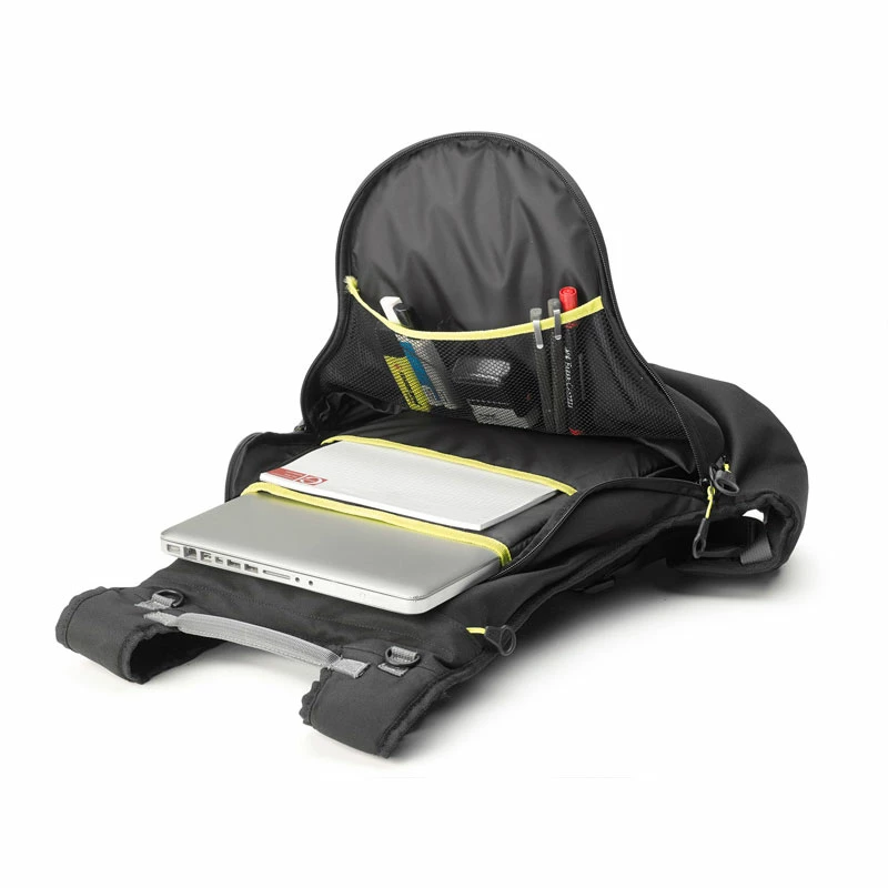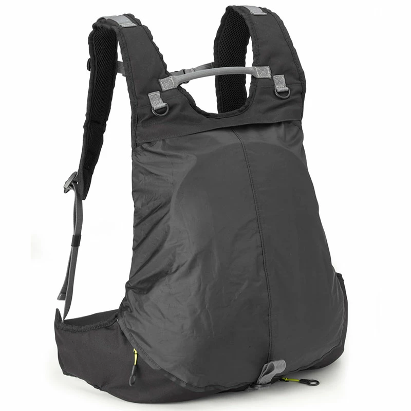 Expandable rucksack with helmet holder, 22 ltrs. Materials: made with polyester 600D PU. All materials are developed in accordance with Reach regulations. ((CE) n. 1907/2006) Equipment: Extractable rain-cover. Extractable helmet holder. Inner pockets for documents/mobile phone. Reinforcement in rigid plastic on the rear. Strap to attach it to the waist and chest.