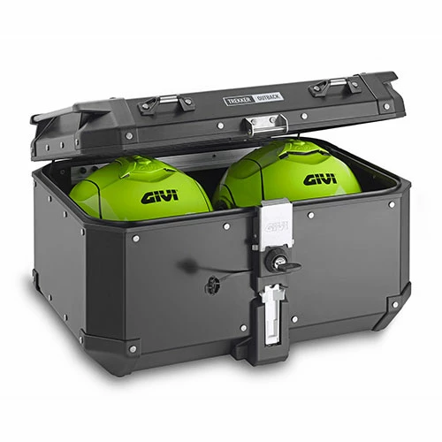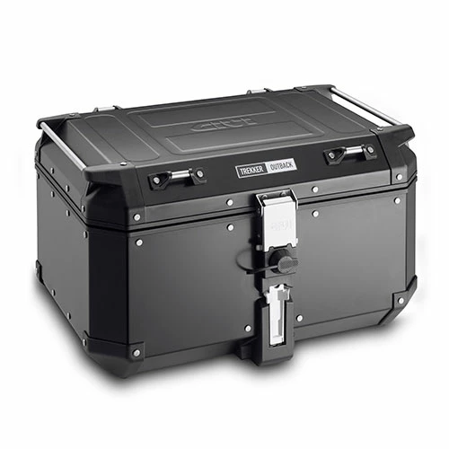 Trekker Outback Black Line aluminum top-case, matt black painted 58 lt. New Trekker Outback Black Line top-case, with aluminum structure and profiles, matt black painted. Available in two different sizes: 42 l. and 58 l. The new version of 42 and 58 Ltr top-cases complete the range of aluminum TREKKER OUTBACK, which do not require any special rack, however they can be attached on any existing Monokey plate. The TREKKER OUTBACK 42 Ltr top-case offers the possibility to load a full-face or a modular helmet. The reduced dimensions allow on almost all motorcycle models, the ability to fully open the side cases without removing the lid. Those who need to increase the load capacity of the top-case or to stow two full-face or modular helmets in the same case, may instead opt for the 58 ltr larger version. For those who prefer the all-black look, the Trekker Outback Black Line range is now available, made in painted black aluminum. The flat lid and four strap loops are the standard equipment of the OUTBACK cases, and offer the possibility to store objects even on the top of the lid, while inside it is possible to secure items to the underside of the lid with an elastic net (optional) which can be secured with existing hooks. Among the standard features we mention is a mat made in soft material, which placed on the bottom of the case will absorb shock transmitted during riding. A range of optional accessories will be available soon, that will allow you to customize the top case the way you like.