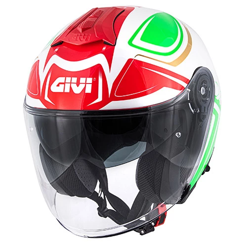 Jet helmet in thermoplastic material. Equipped with: Sun visor. Top vent. Extractor. Micrometric strap. Removable and washable internal lining.