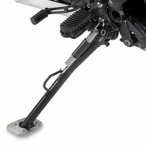 Specific support in aluminum and stainless steel to widen the surface support area of the original side stand.