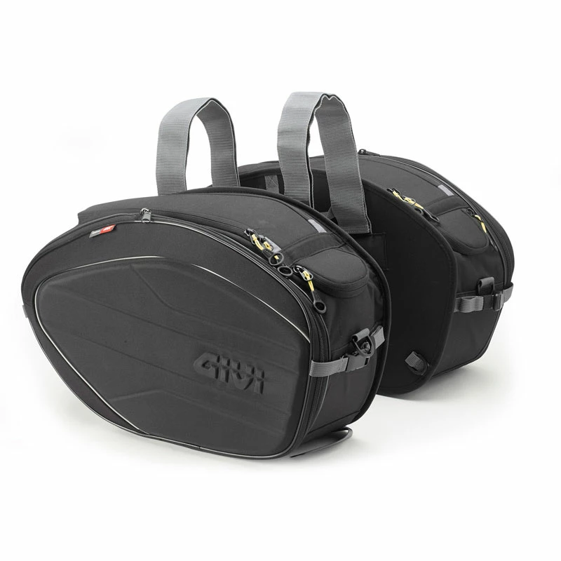 Pair of small expandable saddle bags 40 ltrs System of rapid lock with belts, with hook and loop fastener and central safety belt. Materials: made with polyester 600D PU, the thermoformed frontal in EVA, coated in Lycra, increases rigidity and stability. All materials are developed in accordance with Reach regulations. ((CE) n. 1907/2006). Equipment: Rain cover. Shoulder belt. 2 elastic bungees with hooks. Reinforcements in rigid plastic.
